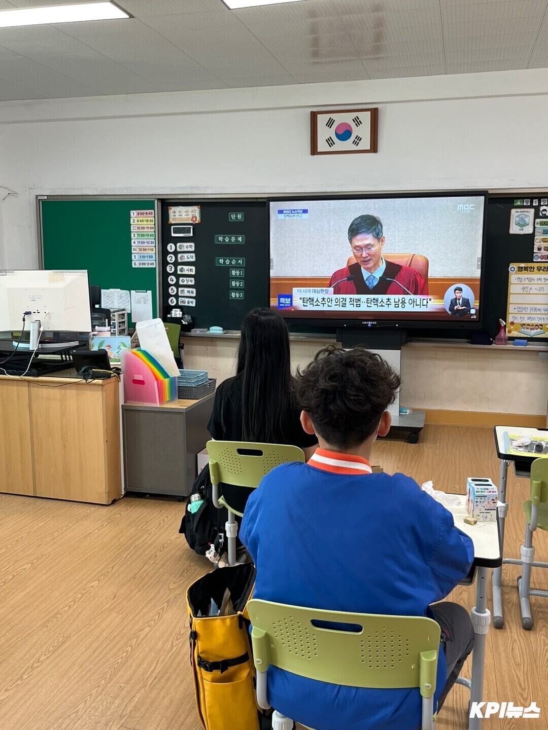 | ▲ 4일 오전 11시 전남 목포에 소재한 한 초등학교에서 학생들이 문형배 헌법재판소장 권한대행의 '윤석열 대통령 탄핵심판 선고 주문' 생방송을 시청하고 있다. [강성명 기자] |