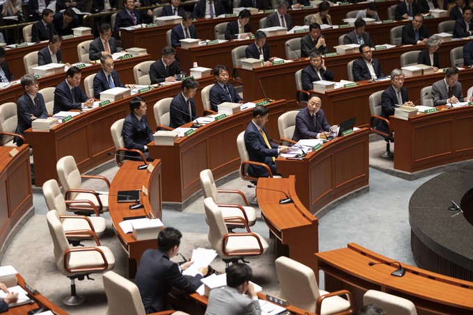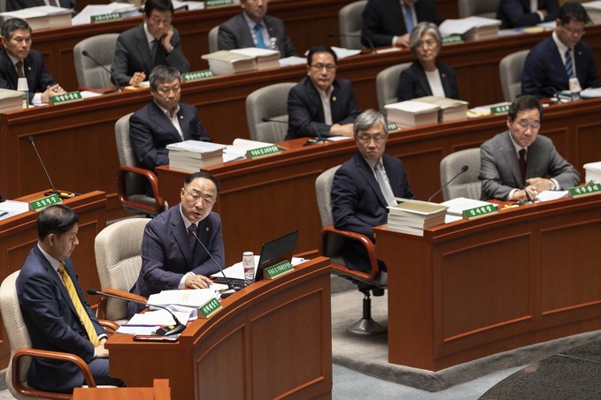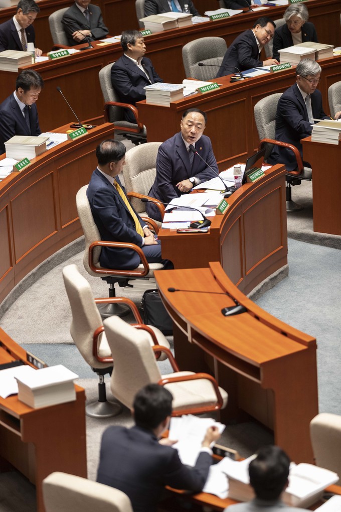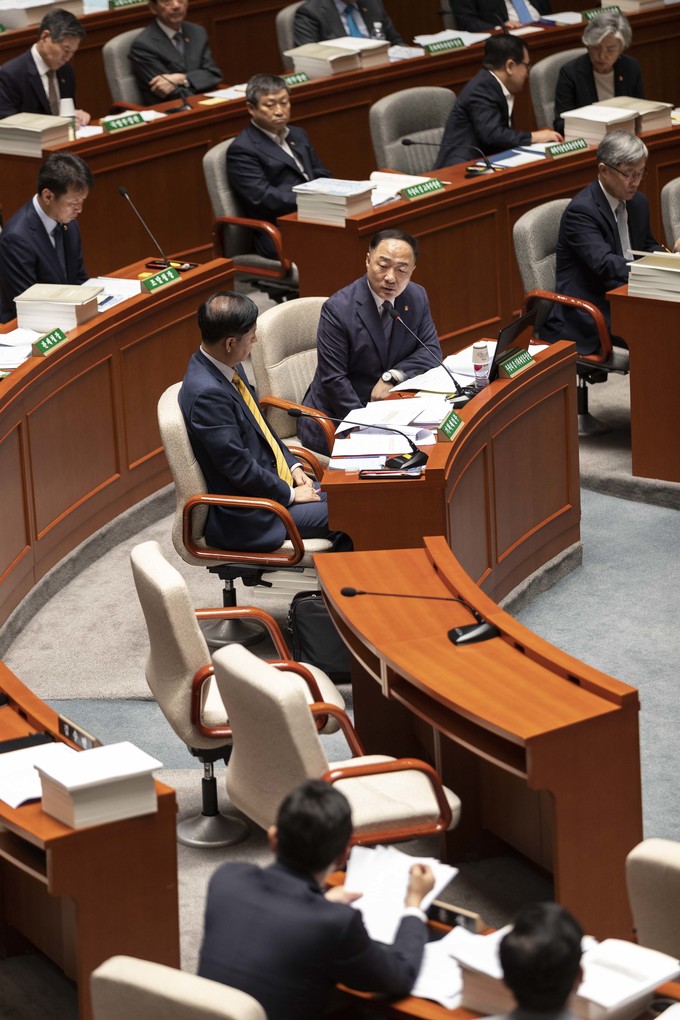 홍남기 경제부 총리가 26일 오전 서울 여의도 국회에서 열린 예산결산위원회 전체회의에 출석해 의원 질의에 답하고 있다.