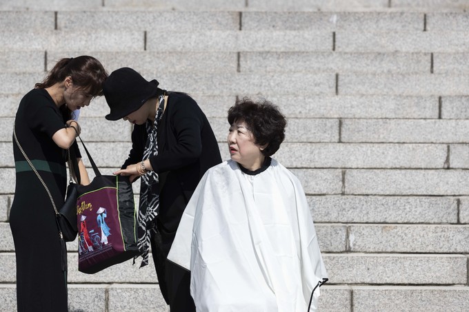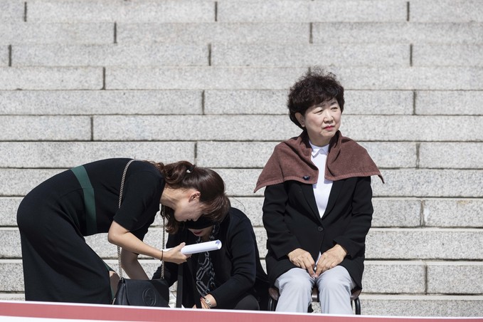 자유한국당 박인숙 의원(오른쪽)이 11일 오전 서울 여의도 국회 본관 앞 계단에서 조국 법무부장관 사퇴 촉구 삭발식을 앞두고 의자에 앉아 있다.