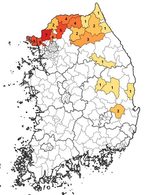 | ▲전국 ASF 발생 분포도 [경기도 제공] |