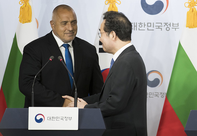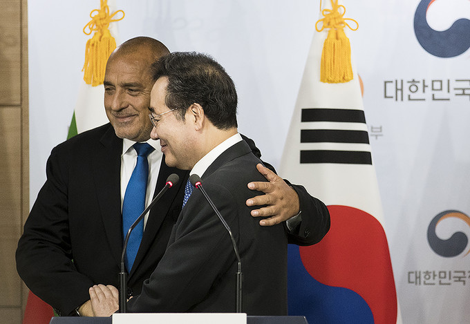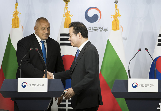 이낙연 국무총리와 보이코 보리소프 불가리아 총리가 26일 오전 서울 종로구 정부서울청사에서 열린 한-불가리아 공동기자회견을 마친 뒤 악수를 하고 있다.