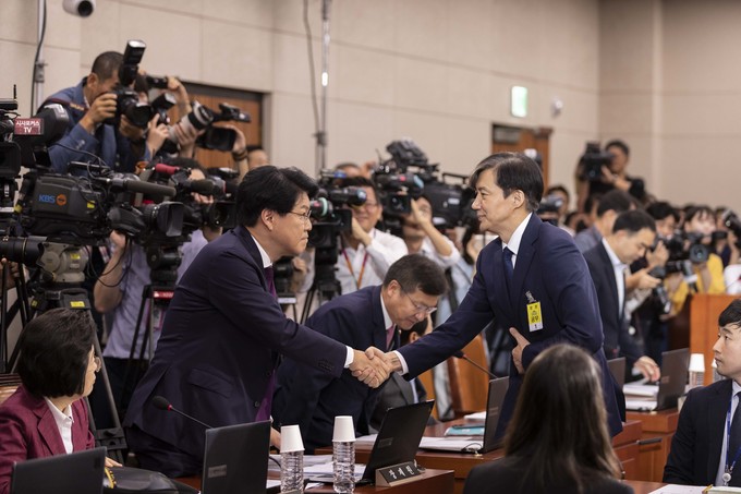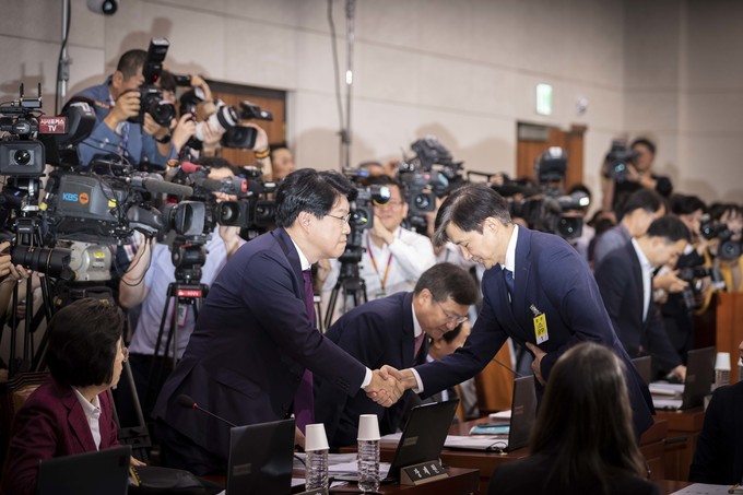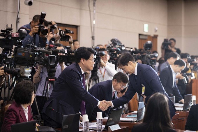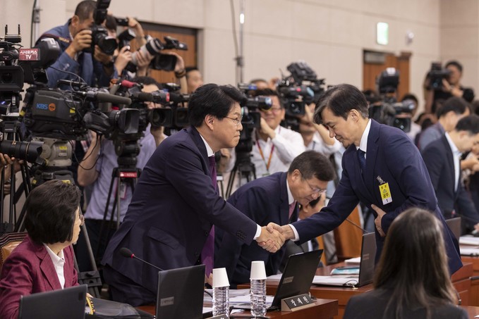 조국 법무부 장관 후보자가 6일 오전 서울 여의도 국회 법사위에서 열린 법무부 장관 후보자 인사청문회에 출석해 자유한국당 장제원 간사와 악수를 하고 있다.
