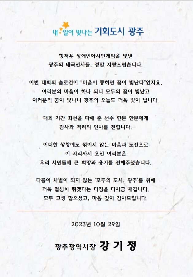 강기정 시장은 항저우 장애인아시안게임에 출전한 9개 종목 20명의 광주시 소속 선수들에게 응원의 격려 카드를 보냈다. 또 대회에서 메달을 획득한 선수들에게 “선수들 곁에 광주시민이 있고 시장이 있다”며 “여러분이 자랑스럽고 고맙다. 건강한 모습으로 귀국해서 만나자”는 축하메시지를 전했다.