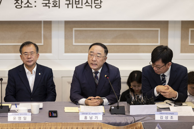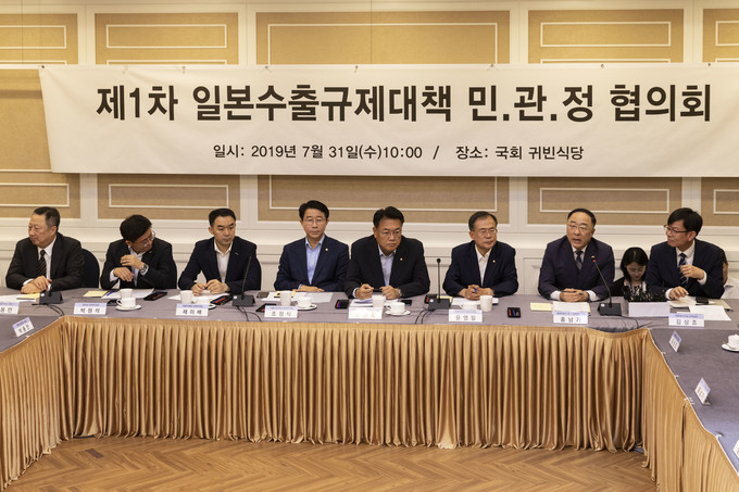 홍남기 경제부 총리겸 기획재정부 장관(오른쪽)이 31일 오전 서울 여의도 국회에서 열린 제1차 일본수출규제대책 민·관·정 협의회 회의에 참석해 발언하고 있다.