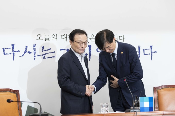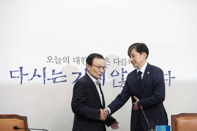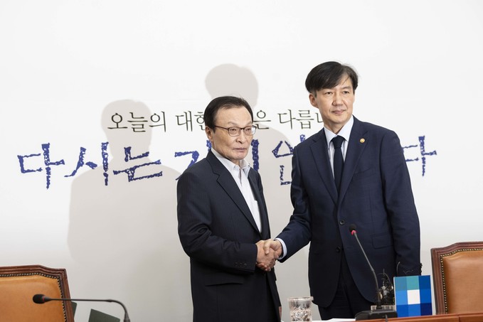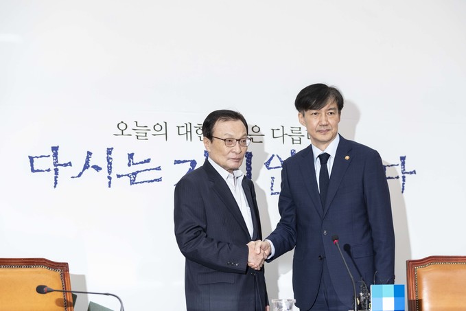 조국 법무부장관(오른쪽)이 17일 오전 서울 여의도 국회 더불어민주당 당대표실에서 이해찬 대표를 예방하고 있다.
