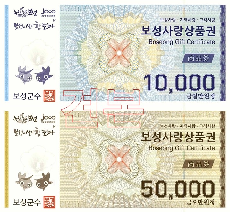 ‘보성사랑상품권’ 지류형은 2종류(1만 원권, 5만 원권)로 개인 구매 한도는 월 70만 원(연 840만 원)으로 현재까지 212억 원을 발행해 지역 상권 활성화에 힘쓰고 있다.