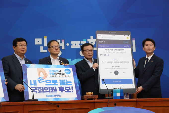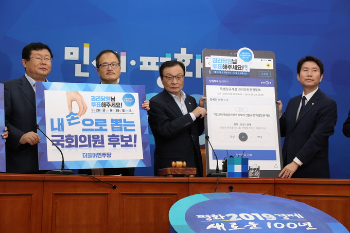더불어민주당 이해찬 대표(왼쪽 세번째)와 이인영 원내대표(왼쪽 네번째) 등 당 지도부가 28일 오전 서울 여의도 국회에서 열린 최고위원회의에서 '권리당원투표'를 홍보하는 피켓을 들고 있다.