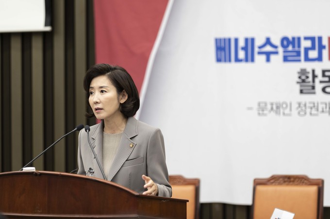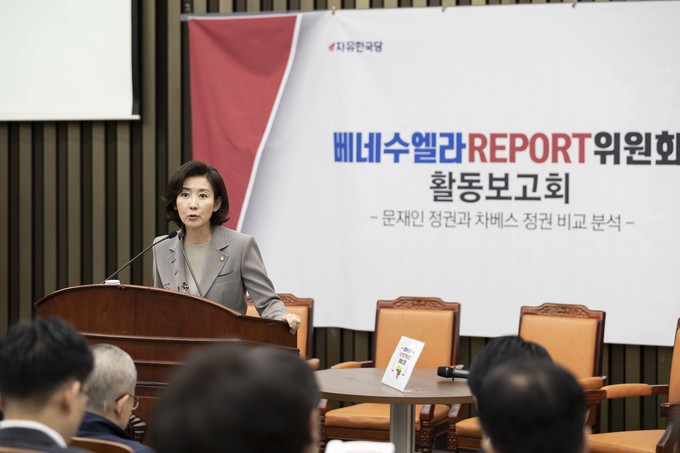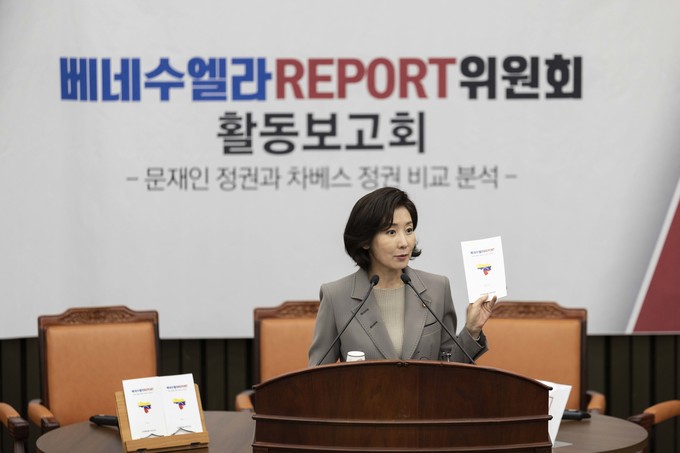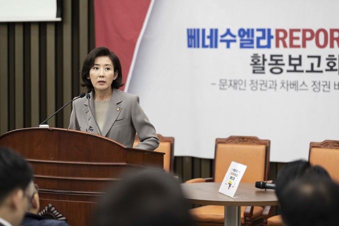 자유한국당 나경원 원내대표가 20일 오전 서울 여의도 국회에서 열린 '베네수엘라 리포트위원회 활동보고회'에 참석해 발언하고 있다.
