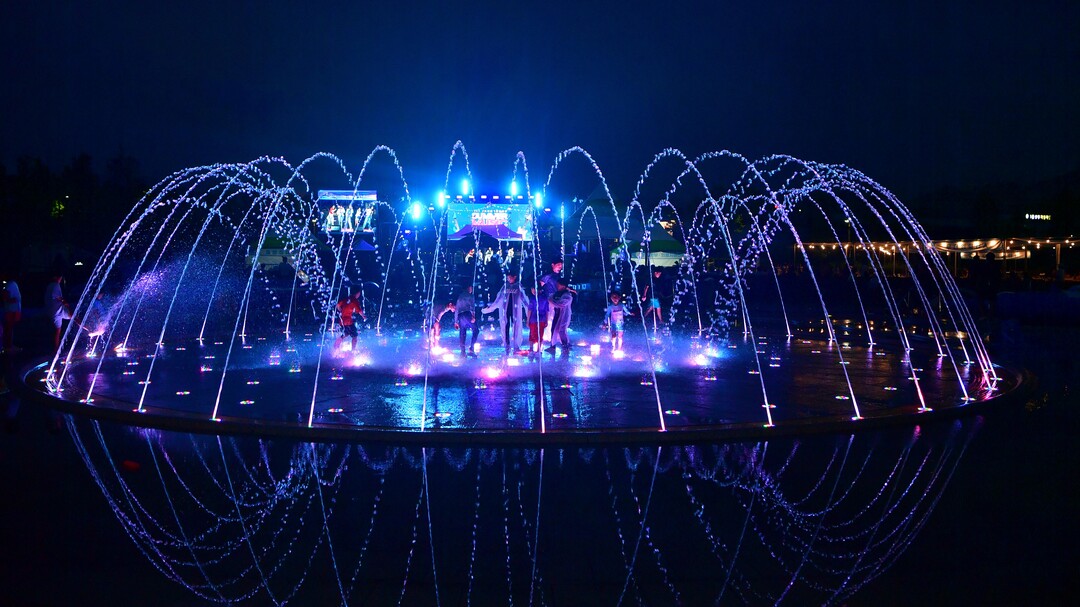 삼계면 상무평화공원 바닥분수도 인기가 높다. 음악에 맞춰 물줄기가 연출되는 음악분수와 화려한 조명이 피서객에게 '시원한 여름'을 선사한다.
