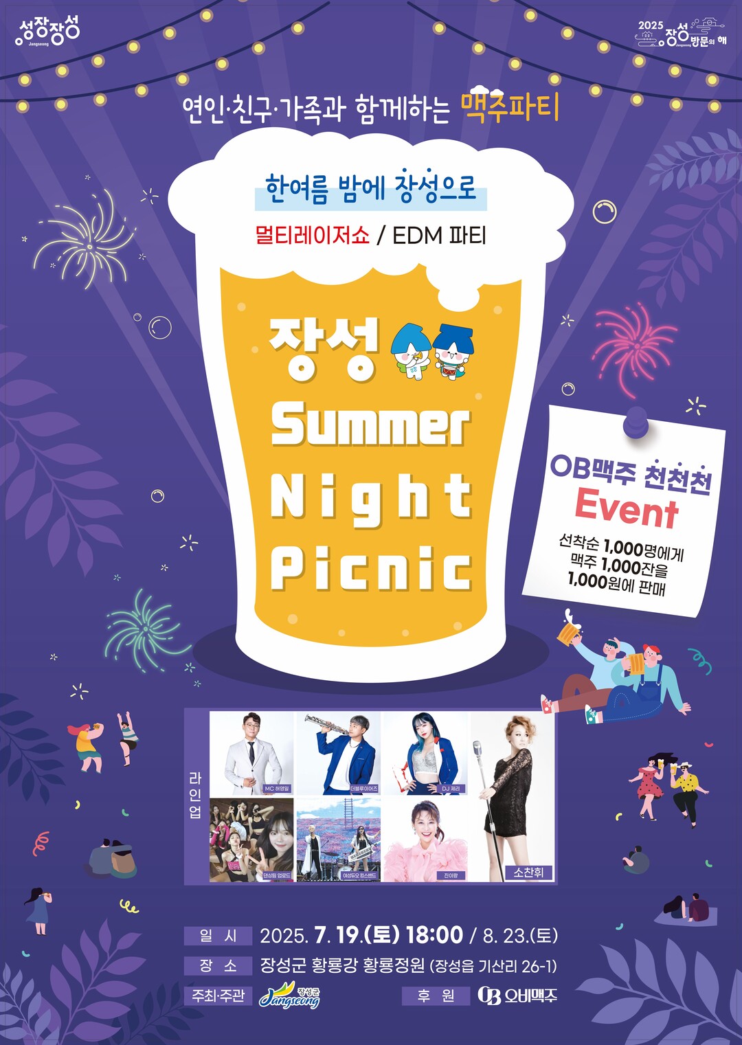 오는 19일 오후 6시 황룡정원 야외무대에서 '장성 썸머나잇 피크닉'이 열린다. 폭발적인 가창력을 지닌 가수 소찬휘를 필두로 더위에 지친 사람에게 활력소가 될 음악을 들려준다. 선착순 1000명에게 맥주 1000잔을 1000원에 판매하는 행사도 연다.