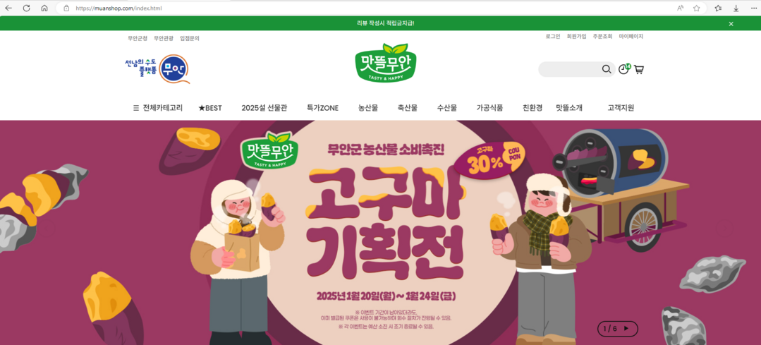 무안군은 행사기간 고구마 전 품목을 30% 할인된 가격에 만나볼 수 있고 신규 회원에게 쿠폰 2000원을 추가 지급한다고 21일 밝혔다.