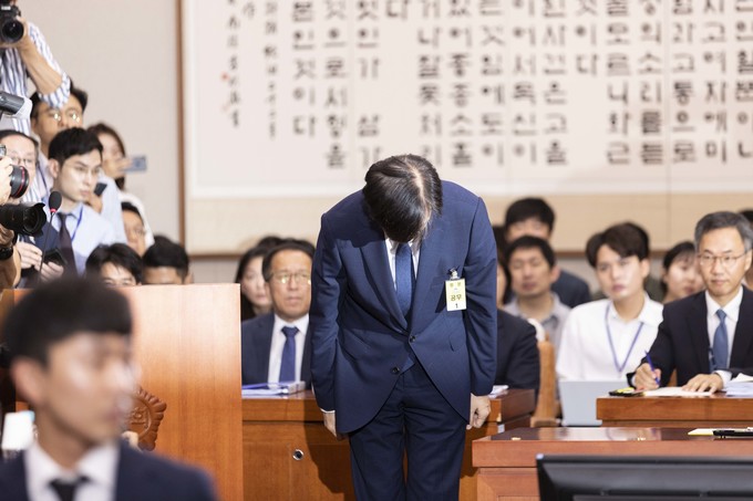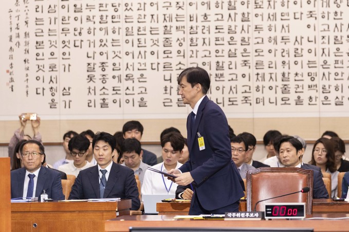 조국 법무부 장관 후보자가 6일 오전 서울 여의도 국회 법사위에서 열린 법무부 장관 후보자 인사청문회에 출석해 선서를 하고 있다.