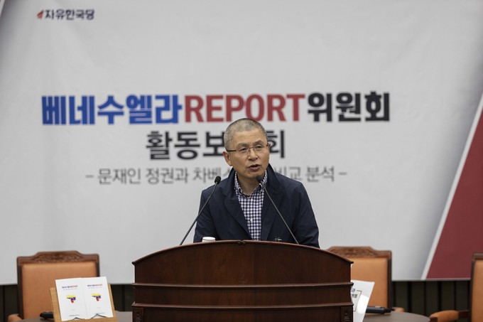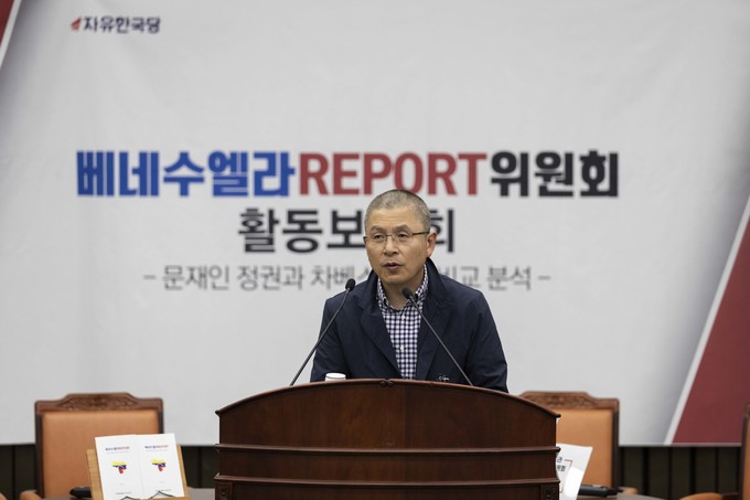 자유한국당 황교안 대표가 20일 오전 서울 여의도 국회에서 열린 '베네수엘라 리포트위원회 활동보고회'에 참석해 발언하고 있다.