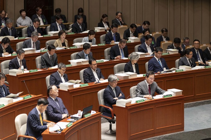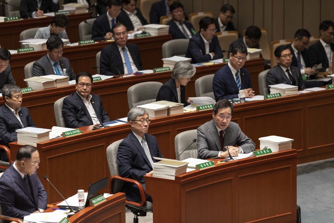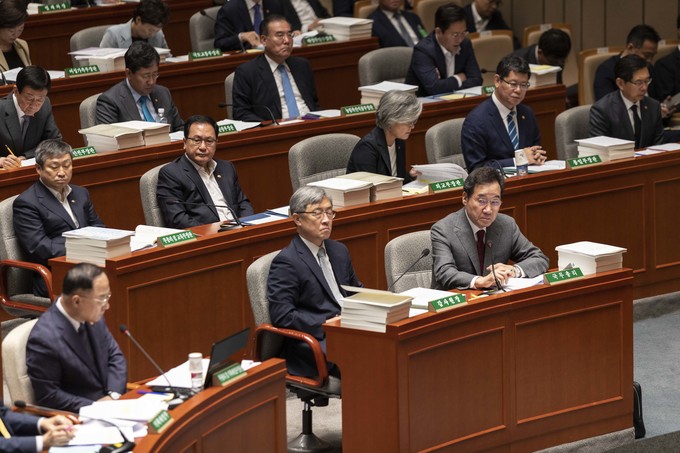 이낙연 국무총리가 26일 오전 서울 여의도 국회에서 열린 예산결산위원회 전체회의에 출석해 의원질의에 답하고 있다.