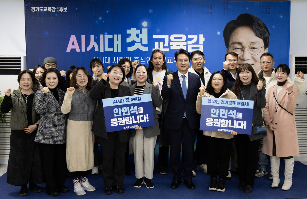 | ▲ 지난 6일 안민석 경기교육감 예비후보가 경기지역 교육활동가와 문화·예술·AI 등 분야 전문가들로 구성된 경기마을교육공동체 준비위원회와 정책 간담회를 가진 뒤 기념촬영을 하고 있다. [안민석 예비후보 캠프 제공] |