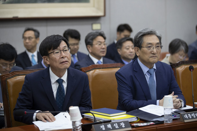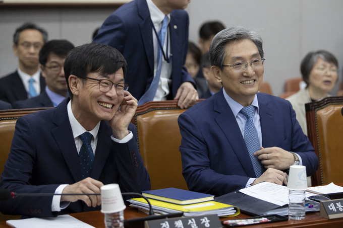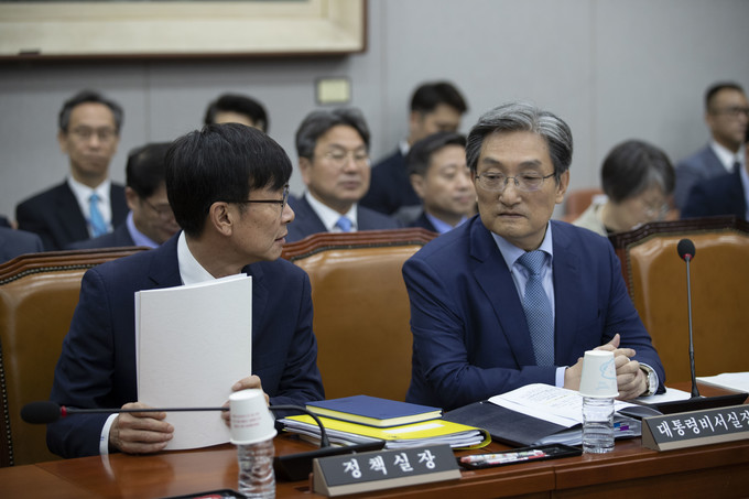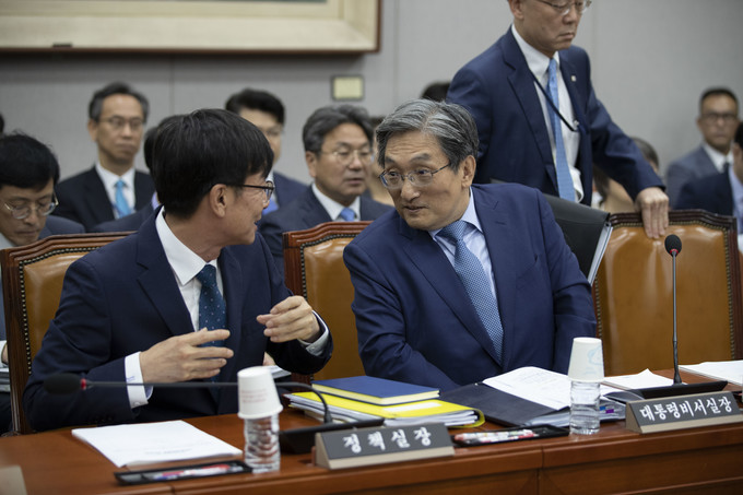 노영민 대통령비서실장(오른쪽)과 김상조 정책실장이 6일 오전 서울 여의도 국회에서 열린 운영위원회 전체회의에 출석하고 있다.