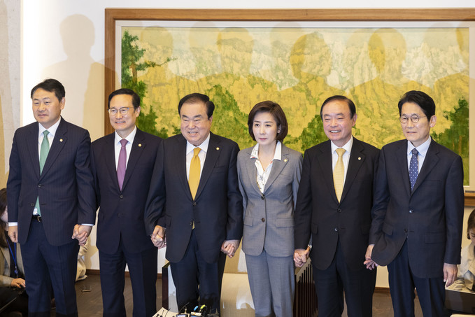 22일 오전 서울 여의도 국회에서 열린 국회의장-5당 원내대표 회동에 참석한 김관영 바른미래당 원내대표(왼쪽부터), 홍영표 더불어민주당 원내대표, 문희상 국회의장, 나경원 자유한국당 원내대표, 장병완 민주평화당 원내대표, 윤소하 정의당 원내대표가 포즈를 취하고 있다.
