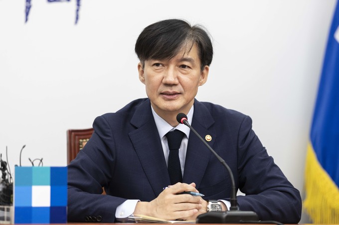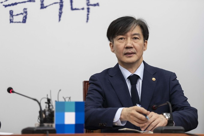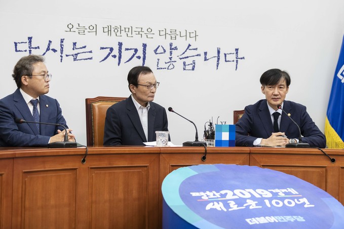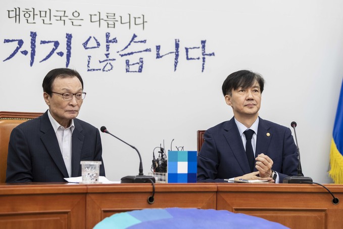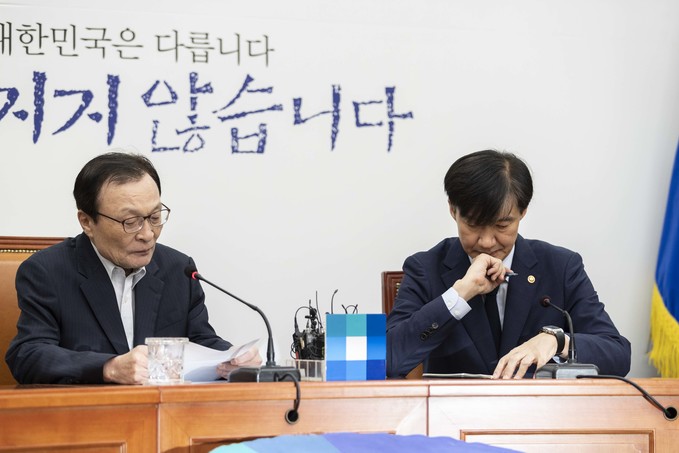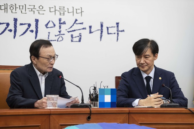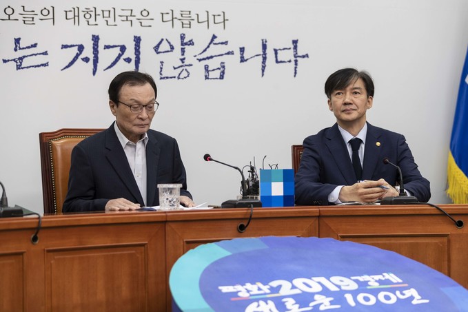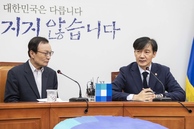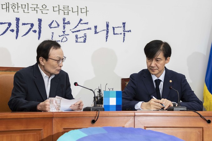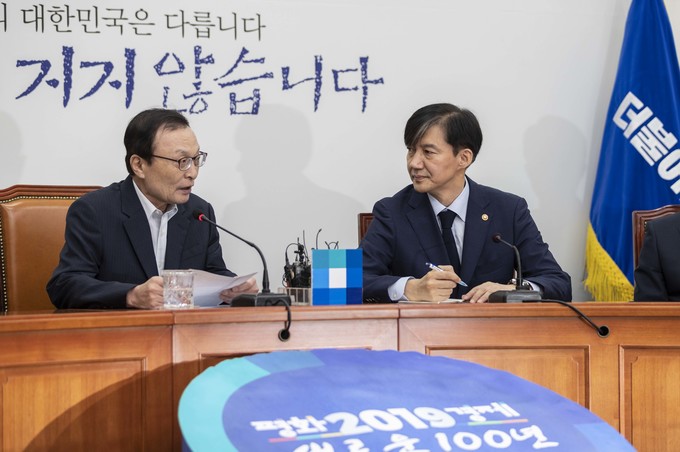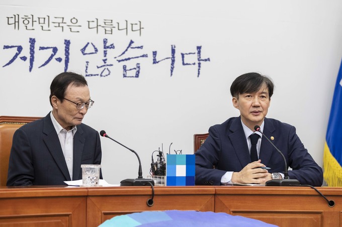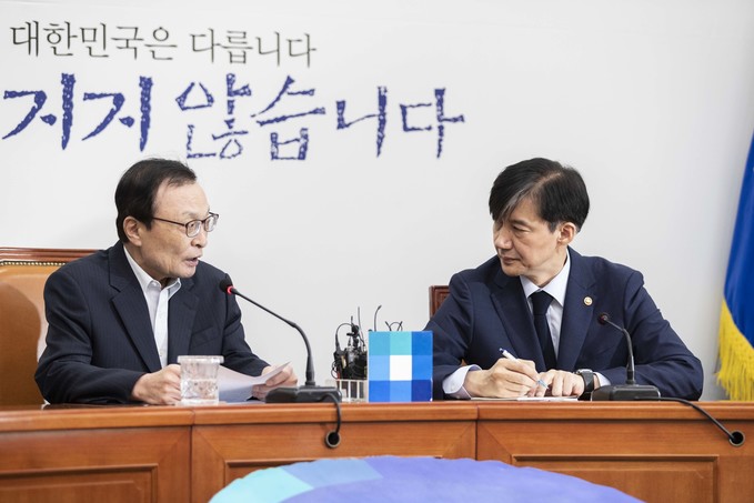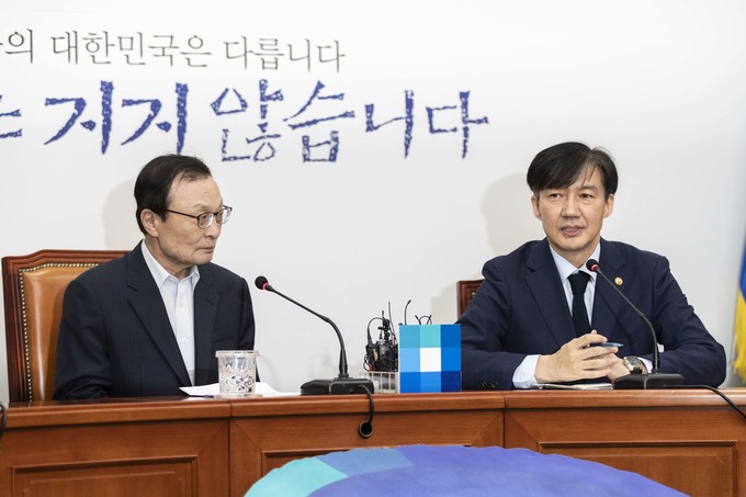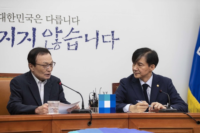 조국 법무부장관(오른쪽)이 17일 오전 서울 여의도 국회 더불어민주당 당대표실에서 이해찬 대표를 예방하고 있다.