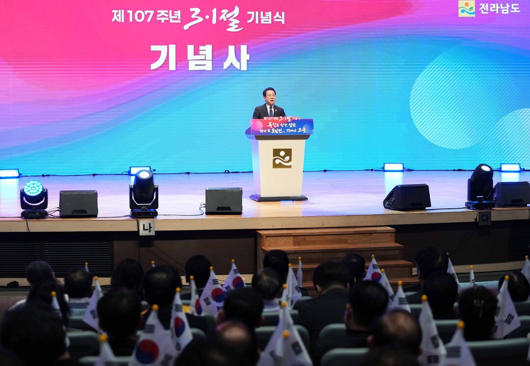 | ▲ 김영록 전라남도지사가 1일 전남도청 김대중강당에서 열린 '제107주년 3·1절 기념식'에서 기념사를 하고 있다. [전남도 제공] |