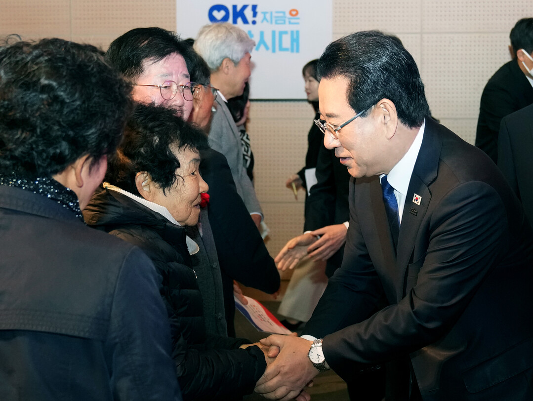 | ▲ 김영록 전라남도지사가 1일 전남도청 김대중강당에서 열린 '제107주년 3·1절 기념식'에서 독립유공자 후손들을 격려하고 있다. [전남도 제공] |
