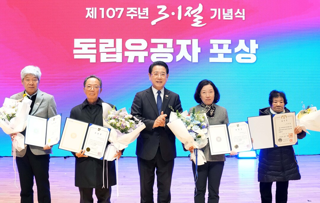| ▲ 김영록 전라남도지사가 1일 전남도청 김대중강당에서 열린 '제107주년 3·1절 기념식'에서 유공자들에게 표창을 수여한 뒤 기념촬영을 하고 있다. [전남도 제공] |