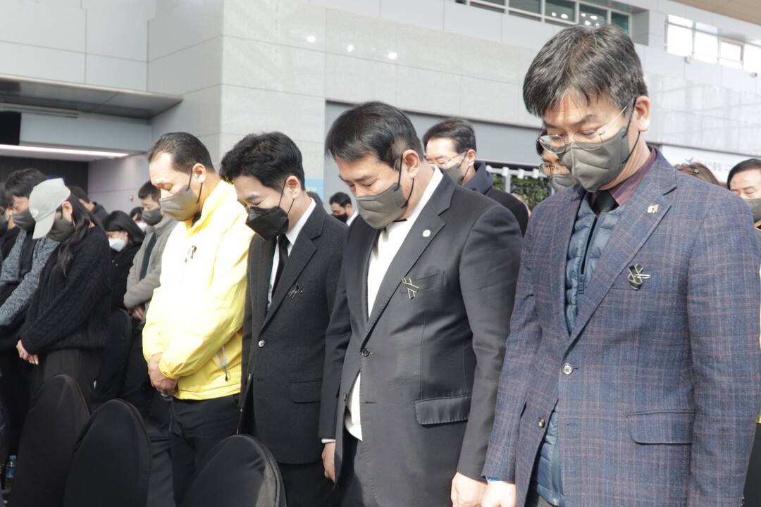 | ▲ 18일 전남 무안국제공항에서 열린 12.29 제주항공 여객기 참사 희생사 합동추모식에서 김대중 전남교육감과 이정선 광주시교육감이 묵념을 하고 있다. [강성명 기자] |