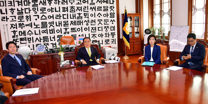 문희상 국회의장이 30일 오전 서울 여의도 국회 의장실에서 여야 교섭단체 3당 원내대표과 회동을 갖고 있다.