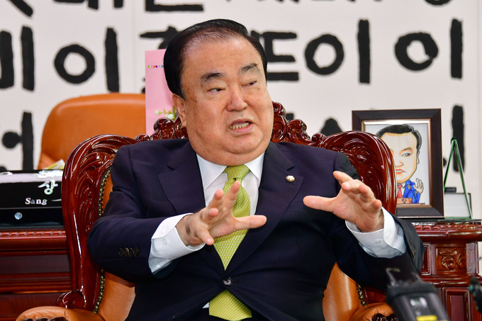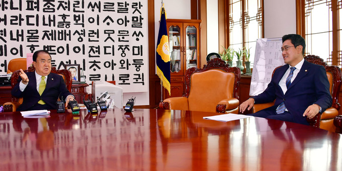 문희상 국회의장(오른쪽)이 30일 오전 서울 여의도 국회 의장실에서 여야 교섭단체 3당 원내대표 회동에 참석, 더불어민주당 이인영 원내대표와 대화를 하고 있다.