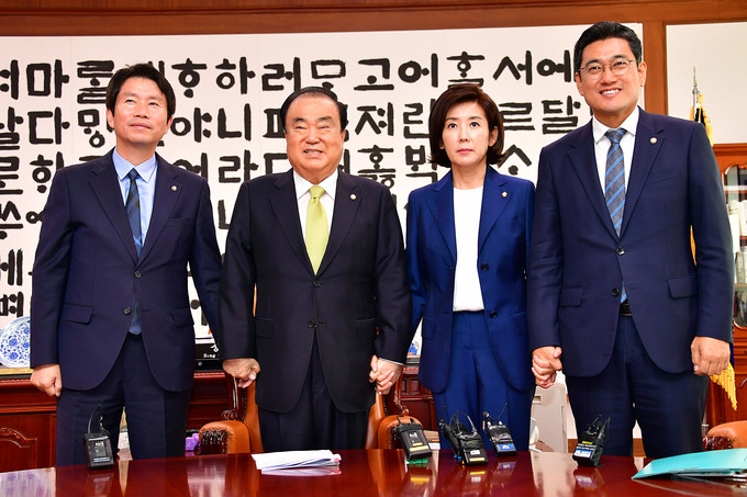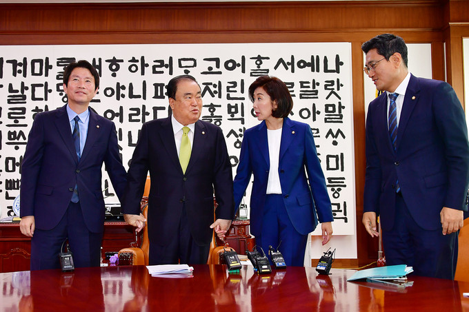 문희상 국회의장과 여야 교섭단체 3당 원내대표들이 30일 오전 서울 여의도 국회 의장실에서 회동을 갖기에 앞서 기념촬영을 하고 있다. 왼쪽부터 더불어민주당 이인영 원내대표, 문 의장, 자유한국당 나경원 원내대표, 바른미래당 오신환 원내대표.