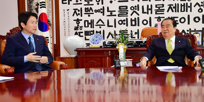 문희상 국회의장(왼쪽)이 30일 오전 서울 여의도 국회 의장실에서 여야 교섭단체 3당 원내대표 회동에 참석, 자유한국당 나경원 원내대표와 대화를 하고 있다.