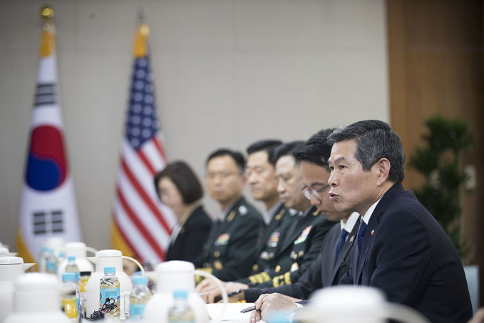 정경두 국방부 장관이 9일 오전 서울 용산구 국방부에서 열린 마크 에스퍼 미국 신임 국방부 장관과의 한미 국방장관 회담에서 모두발언을 하고 있다.