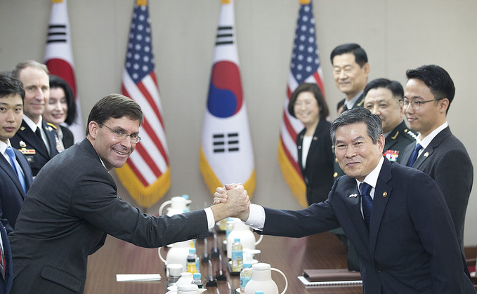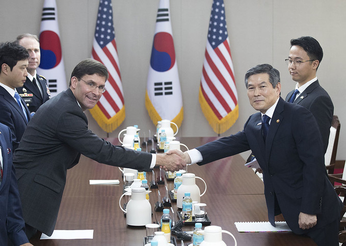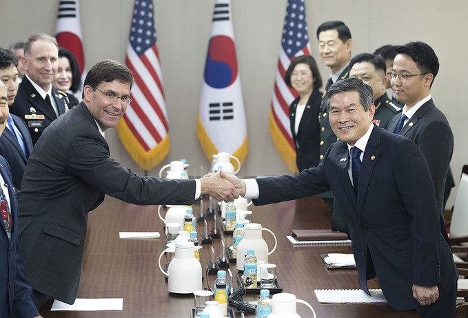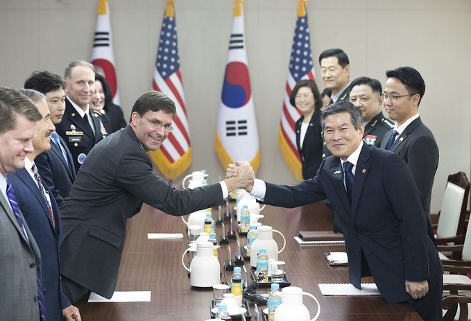 정경두 국방부 장관이 9일 오전 서울 용산구 국방부에서 열린 마크 에스퍼 미국 신임 국방부 장관과의 한미 국방장관 회담에서 악수를 하고 있다.