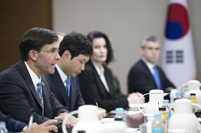 마크 에스퍼 미국 신임 국방부 장관이 9일 오전 서울 용산구 국방부에서 열린 정경두 국방부 장관과의 한미 국방장관 회담에서 모두발언을 하고 있다.