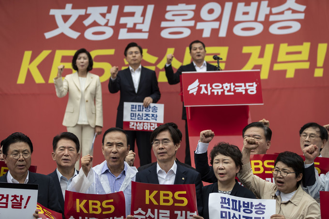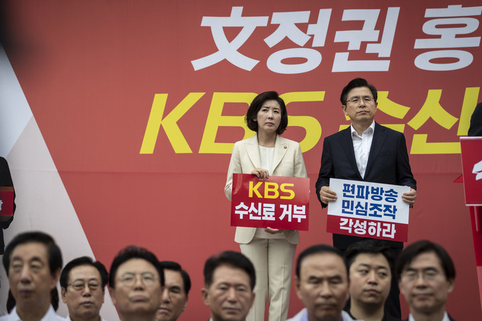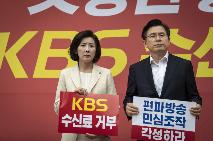 자유한국당 황교안 대표(오른쪽)와 나경원 원내대표가 25일 서울 여의도 국회의사당역 앞에서 열린 'KBS편파방송, 수신료 거부를 위한 전국민서명운동 출정식'에 참석하고 있다.