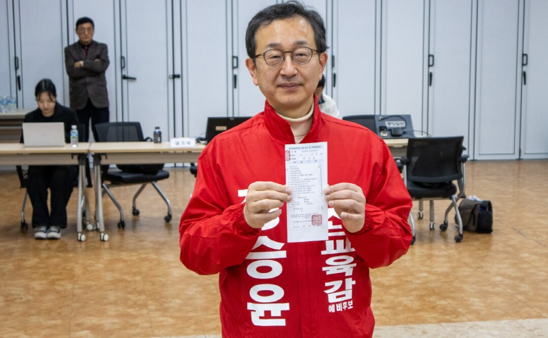 정승윤 후보는 이날 오전 부산시선거관리위원회에서 후보 등록을 한 뒤 진보 성향 김석준 후보의 사법 리스크를 거론하며 "북한과 김일성을 찬양한 전교조 교사를 특별 우대하는 세력에 아이들을 맡길 수 없다"고 포문을 열었다.