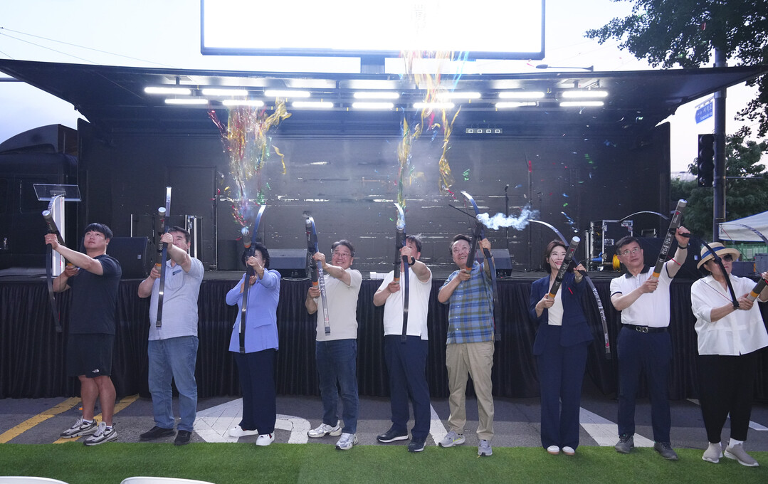 | ▲ 강기정 광주광역시장이 지난 5일 오후 동구 5·18 민주광장에서 열린 '광주2025현대세계(장애인)양궁선수권대회' 성공 개최 기원 시·도민 페스티벌 걷기행사에서 참석해 내빈들과 퍼포먼스를 하고 있다. [광주광역시 제공] |