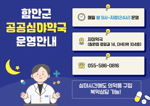함안군은 칠원읍에 위치한 '자이약국'을 공공심야약국으로 지정, 13일부터 운영을 시작했다고 밝혔다.