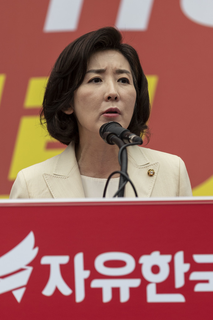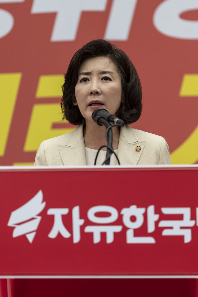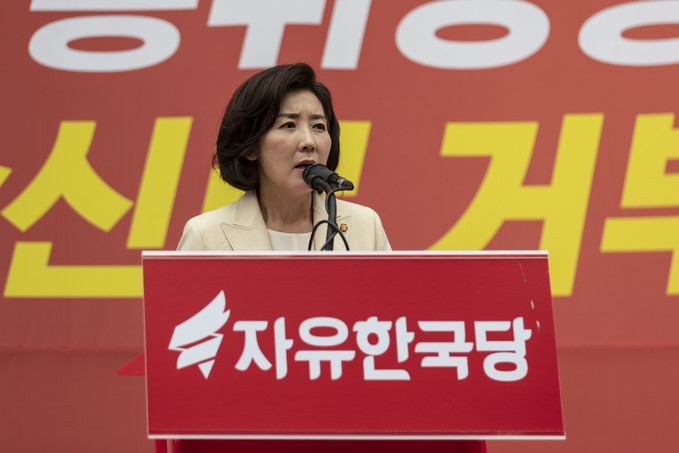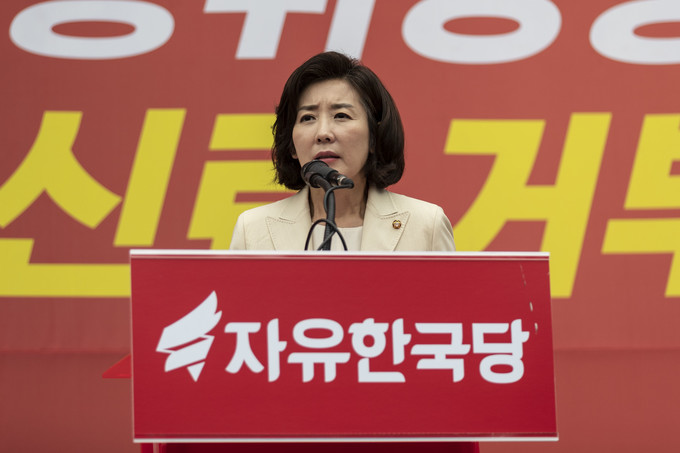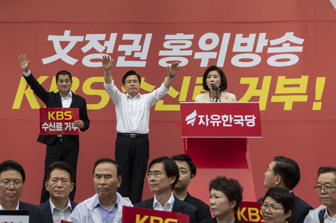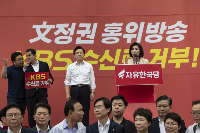 자유한국당 나경원 원내대표가 25일 서울 여의도 국회의사당역 앞에서 열린 'KBS편파방송, 수신료 거부를 위한 전국민서명운동 출정식'에 참석해 발언하고 있다.
