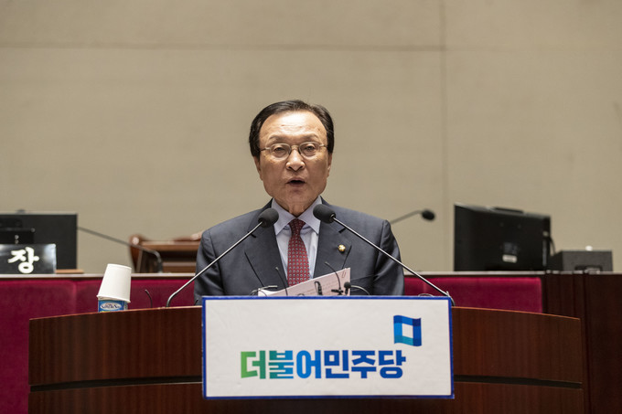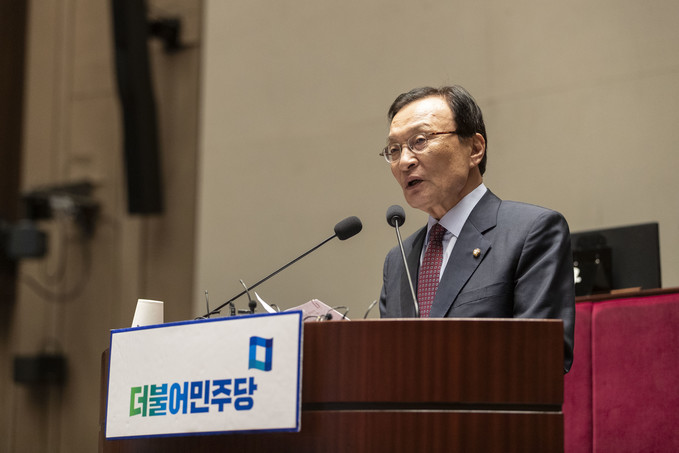 이해찬 더불어민주당 대표가 29일 오전 서울 여의도 국회 예결위회의장에서 열린 더불어민주당 의원총회에 참석해 발언하고 있다.