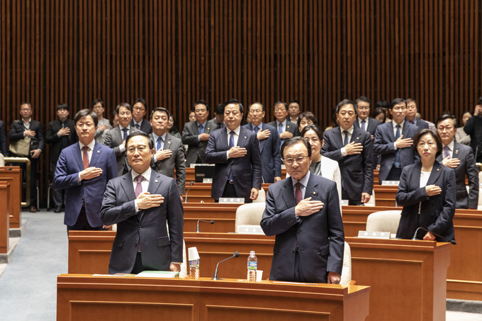 29일 오전 서울 여의도 국회 예결위회의장에서 열린 더불어민주당 의원총회에 참석한 의원들이 국기에 대한 경례를 하고 있다.