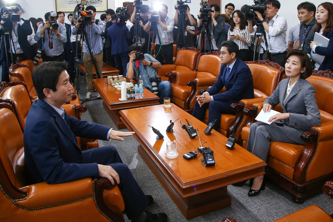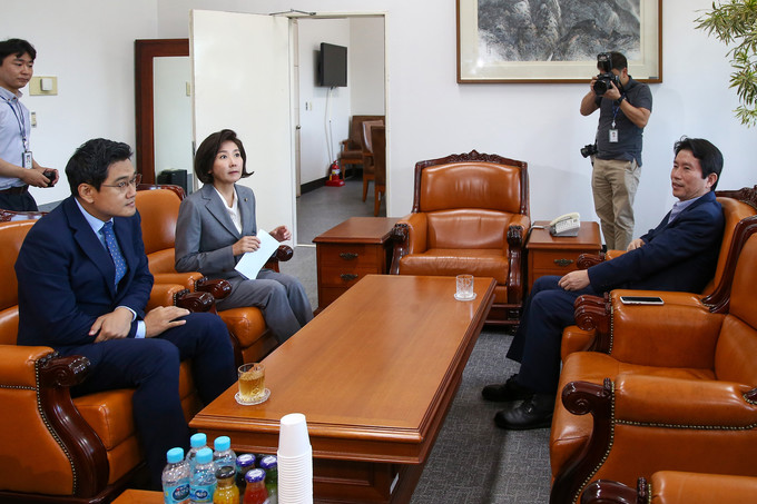 더불어민주당 이인영 원내대표(왼쪽 시계방향)와 바른미래당 오신환 원내대표, 자유한국당 나경원 원내대표가 16일 오전 서울 여의도 국회 운영위원장실에서 여야 교섭단체 원내대표 회동을 하고 있다.