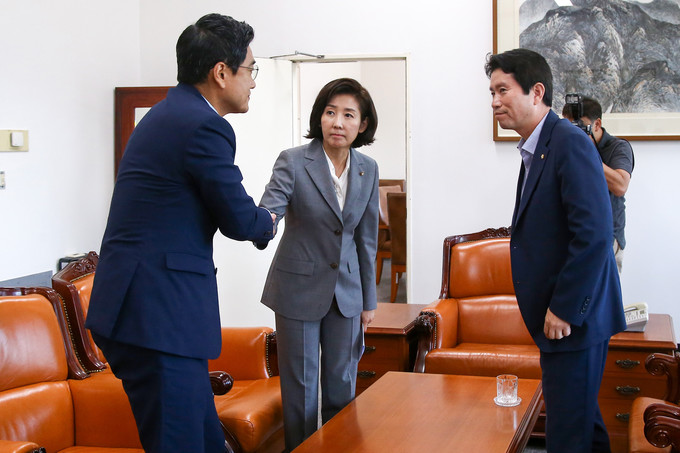 자유한국당 나경원 원내대표와 바른미래당 오신환 원내대표가 16일 오전 서울 여의도 국회 운영위원장실에서 열린 여야 교섭단체 원내대표 회동에서 악수하고 있다.