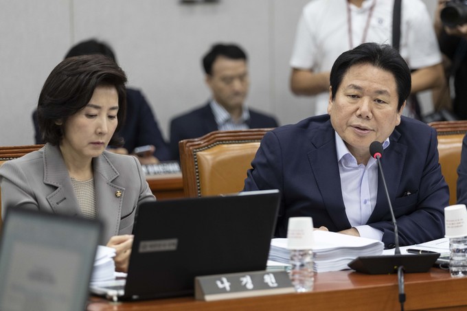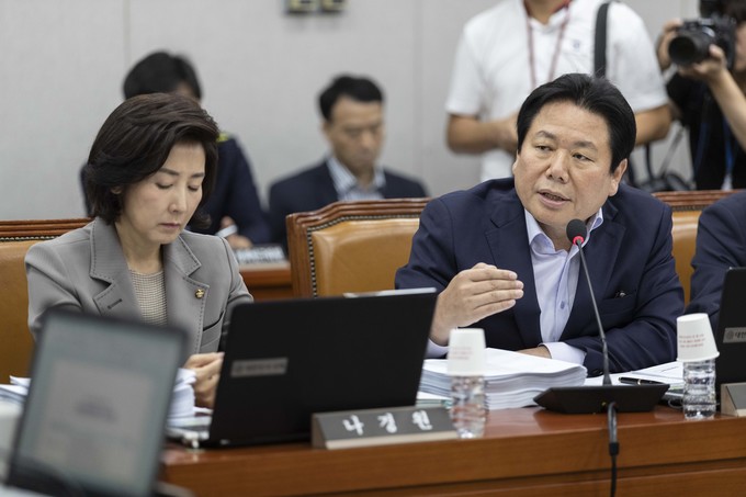 자유한국당 정양석 의원(오른쪽)이 26일 오전 서울 여의도 국회에서 열린 운영위원회 전체회의에 참석해 발언하고 있다.