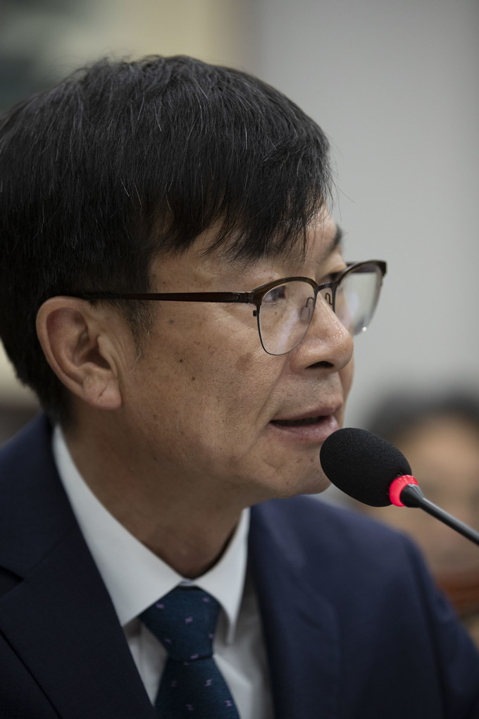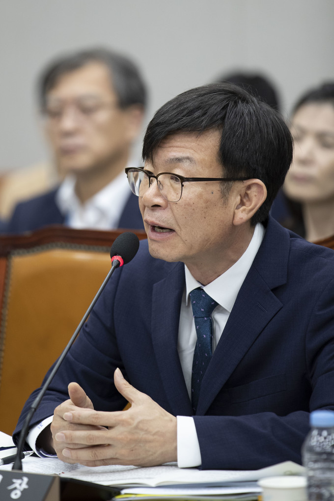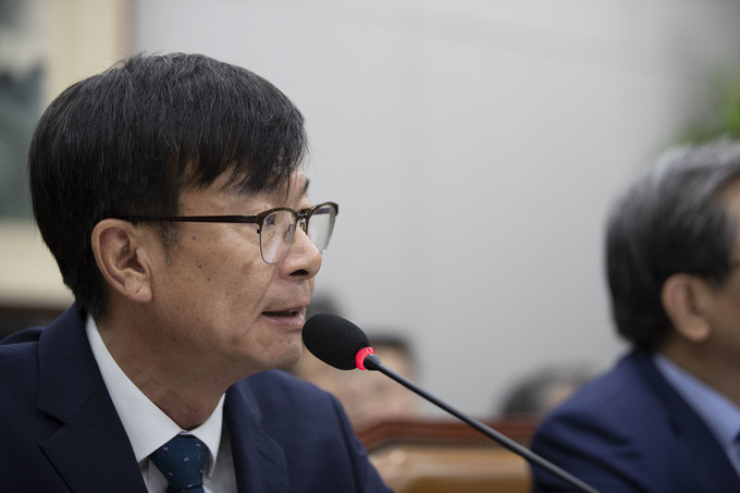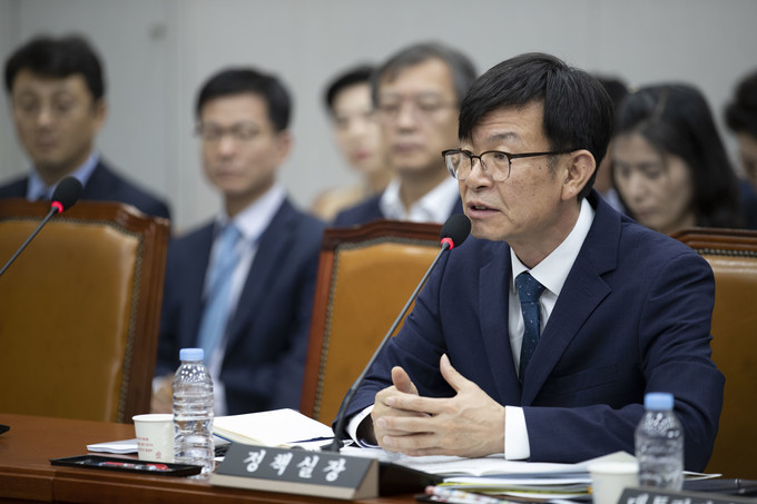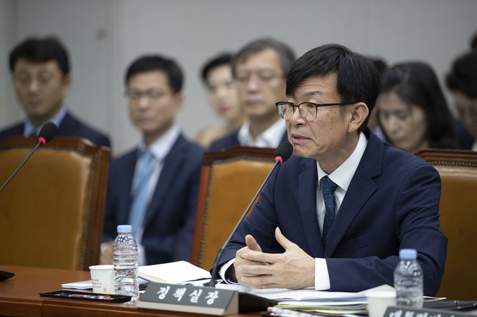 김상조 청와대 정책실장이 6일 오전 서울 여의도 국회에서 열린 운영위원회 전체회의에 출석해 의원질의에 답하고 있다.