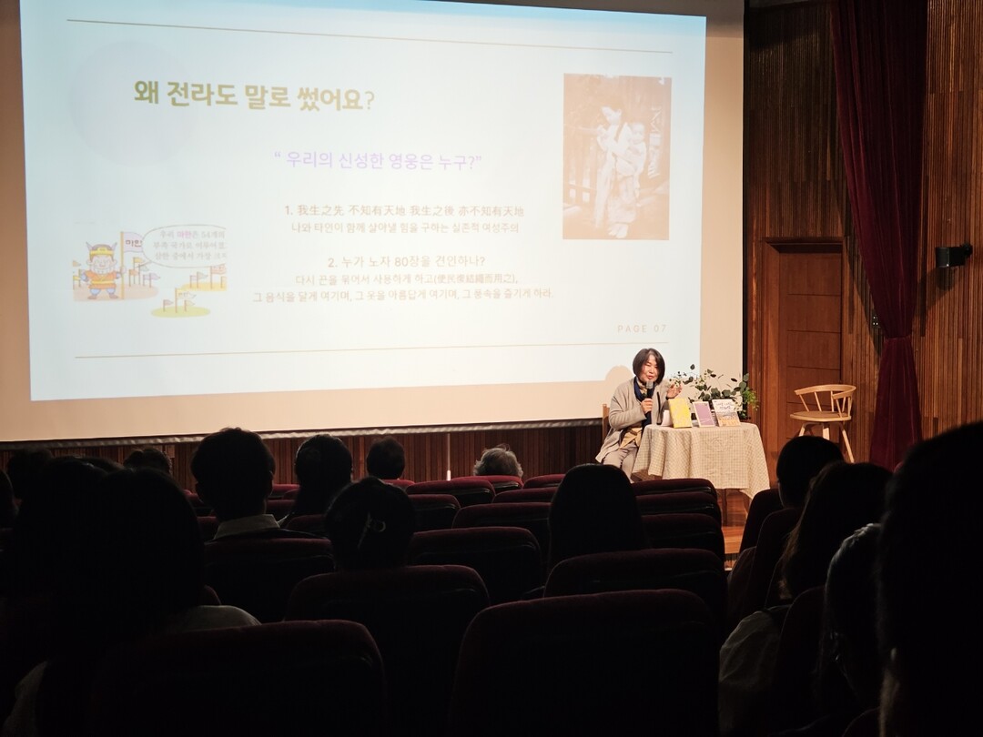 이날 강연은 ‘항꾼에(함께) 살자는 말의 약효에 대하여’를 주제로 옛 영암 여성의 삶을 서사시로 표현한 시집 '그라시재라' 속 시 낭독으로 시작됐다.