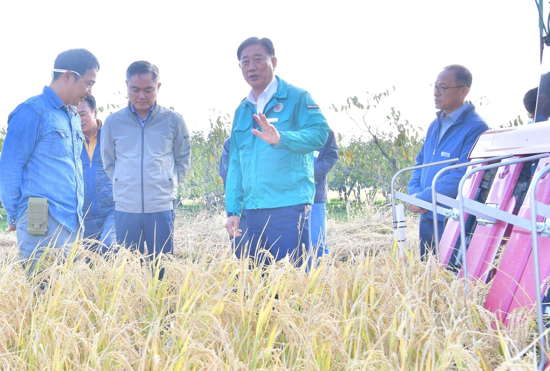 | ▲ 27일 김한종 장성군수가 북이면 가루쌀 수확 현장을 찾은 뒤 생산 주민들의 애로사항을 듣는 등 대화를 나누고 있다. [장성군 제공] |