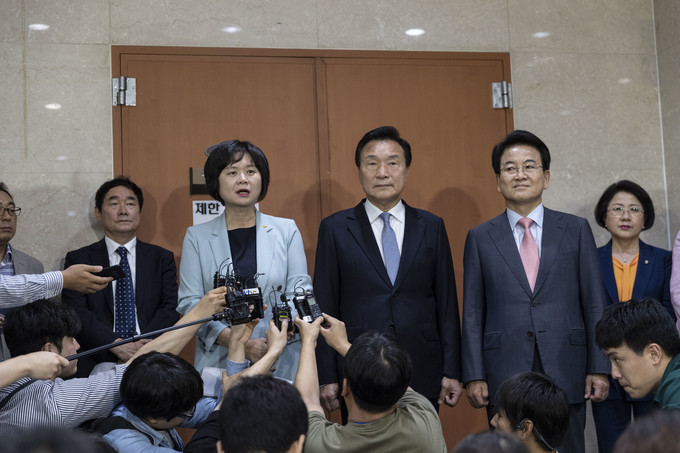 정의당 이정미 대표(왼쪽)가 2일 서울 여의도 국회 정론관에서 야3당 대표 긴급기자회견을 마치고 취재진 질문에 답하고 있다. 왼쪽부터 정의당 이정미 대표, 바른미래당 손학규 대표, 민주평화당 정동영 대표.