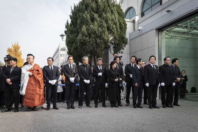 6일 오전 서울 송파구 서울아산병원에서 거행된 배우 신성일의 발인식에 동료후배 배우들이 고인의 마지막 길을 배웅하고 있다.