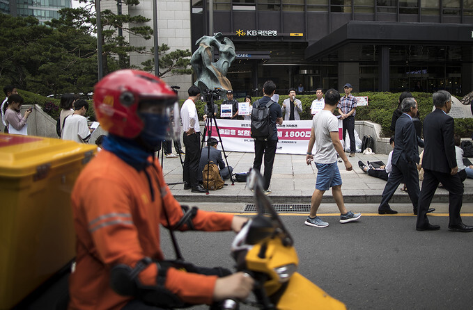 | ▲ 지난 2019년 7월 15일, 배달보험료 현실화 촉구 기자회견장 앞으로 배달노동자가 지나가고 있다.[정병혁 기자] |