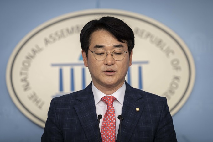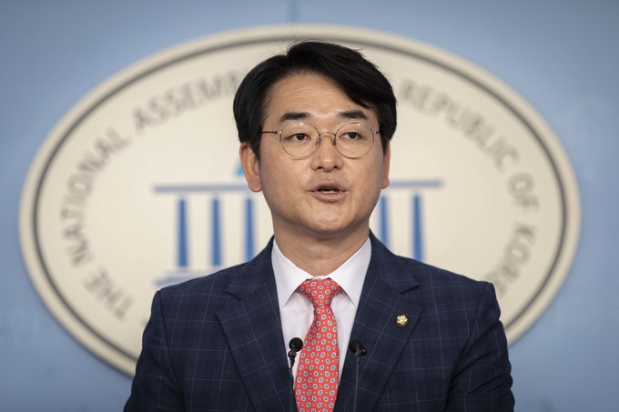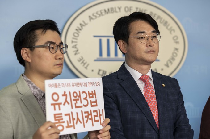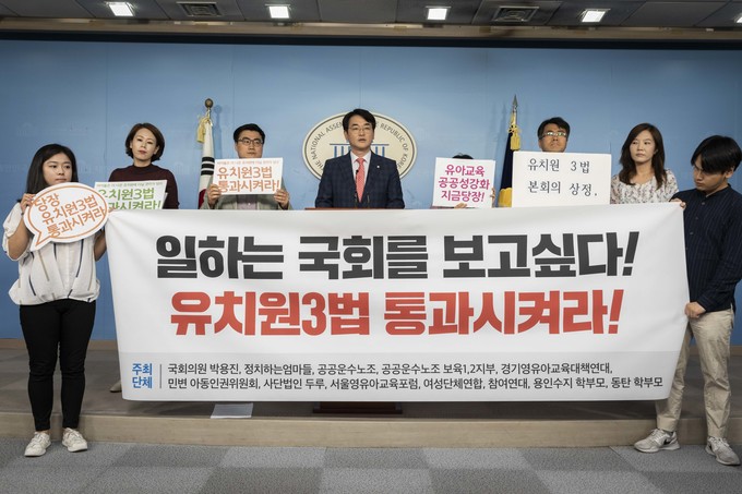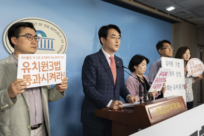 더불어민주당 박용진 의원(가운데)이 30일 오후 서울 여의도 국회 정론관에서 열린 '시민단체와 함께 유치원 3법 촉구'기자회견에 참석해 발언하고 있다.